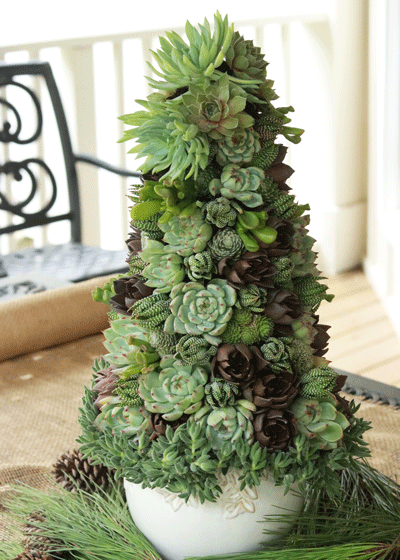 Il est constitué de plantes succulentes de différentes couleurs qui peuvent faire penser aux boules de Noel qui décorent nos arbres classiques. Il s’agit ici du grand modèle qui ne rentrera pas dans tous les logements mais il existe aussi la version mini à disposer sur une table.